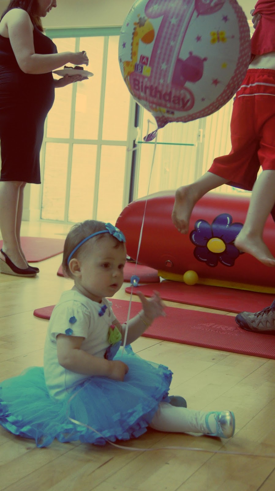 Nelusia była bardzo podekscytowana, nie wiedziała do końca co się dzieje, ale nic jej nie przeszkadzało! Dreptala sobie między balonami! Troszkę z dziadkami, troszkę z ciociami i zabawa była przednia! Wszystkie jej koleżanki wystrojone w sukieneczki jak na prawdziwy bal :) Muzyka typu Fasolki w tle :) Zabrakło tylko nagrania ''100 lat'' w odpowiednim momencie :( a tyle czasu szukaliśmy czegoś odpowiedniego :( no trudno, nie może być idealnie!